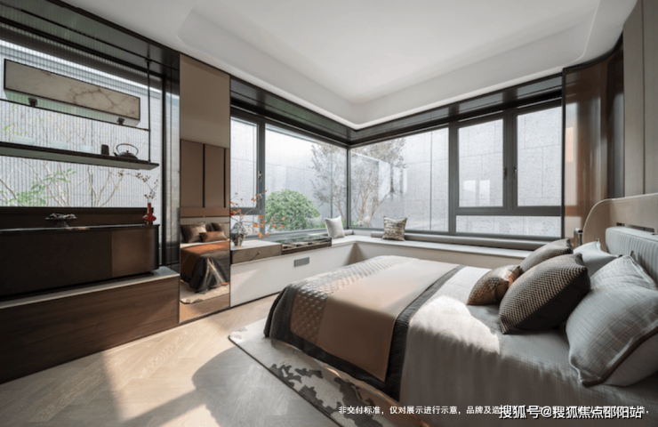 还有奢华无比的主卧,地面采用多层实木复合木地板,以“人字拼”的方式嵌合而成,以人造石打造窗台,天花同样采用弧形吊顶,整个空间因线条的交合呈现更丰富的层次。