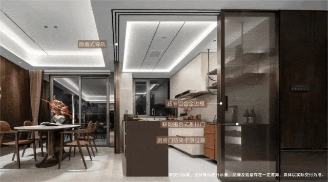 两扇联动围合式金属夹丝推拉门可自由开合,天花板配置照明吹风二合一凉霸及环形灯带,厨房配置的岛台,还带有升降式插座,加上嵌入式博世洗碗机(或同等品牌),将高颜值、科技感、实用性融汇一体。