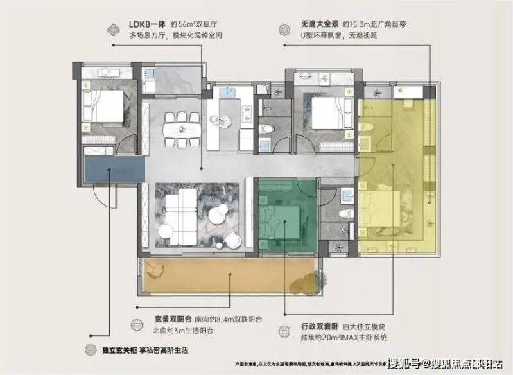 同时,阳台与客厅、餐厅、厨房无缝衔接,形成LDKB一体空间&约56㎡双巨厅尺度,足以演绎N+种居家与聚会场景!还有总长超24米的全屋飘窗,搭配约2万升的超强收纳容量,置物井然有序,生活井井有条。