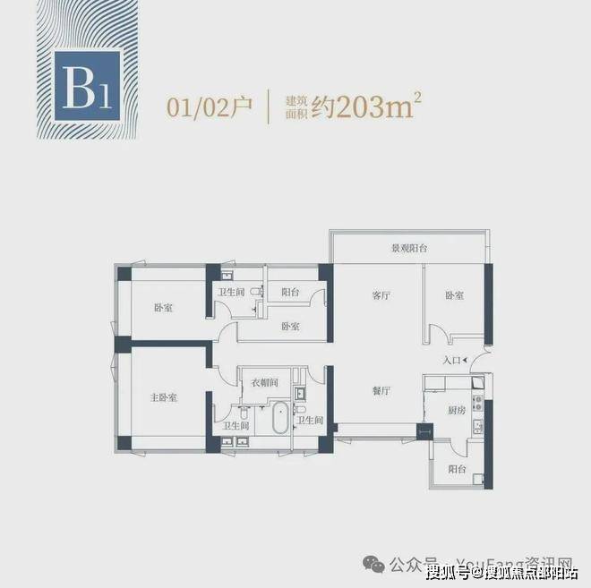 1栋二单元B1户型:面积约为203㎡;