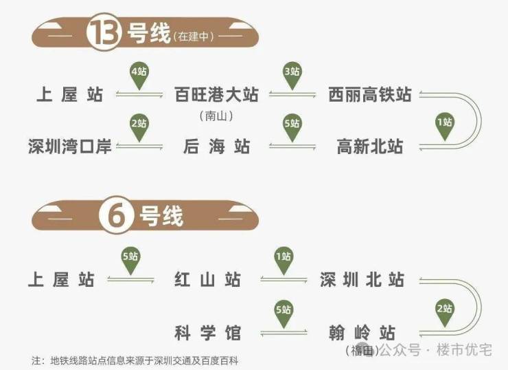 13号线据深圳交通局官网称将在2025年年底开通,该线路也是深圳3条快线之一,号称“深圳科技核心大动脉”,从南到北,串联深圳湾总部基地、后海中心、南山科技园、西丽高铁枢纽、留仙洞总部基地、白芒科研机构、宝安石岩科创城等多个重要片区。沿线华为、中国电子、腾讯、阿里等500强汇集,大批高新人才聚集,形成科创阵地,势必引领片区经济崛起。全程时速120公里,4站到南山百旺港大站,7站到南山西丽高铁站,8站到高新北。