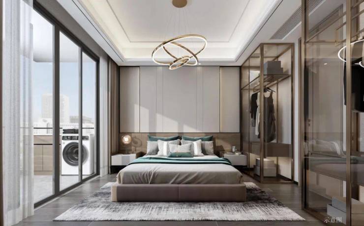 【晨曦星河,观景主卧】套房式主卧设计,自带独立卫浴、衣帽间等功能分区,设计舒适观景飘窗,让夕阳与晨曦在枕间悄然停落。