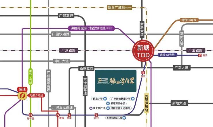 傲立地铁13号线白江站、沙村站中心交汇点,1站黄埔,7站天河,二期未来13站直达珠江新城(在建);后期规划有16号线/20号线/23号线/28号线,其中28号线是全国首条高速跨城地铁,且连接广东最富有的4大城市广州、东莞、佛山,二期连接到深圳,一期预计2028年通车,畅行大湾区。