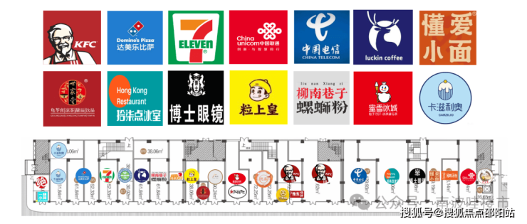 已入驻肯德基、达美乐、7-11、中国电信、中国联通、瑞幸咖啡、拾柒点冰室、粒上皇、蜜雪冰城等。