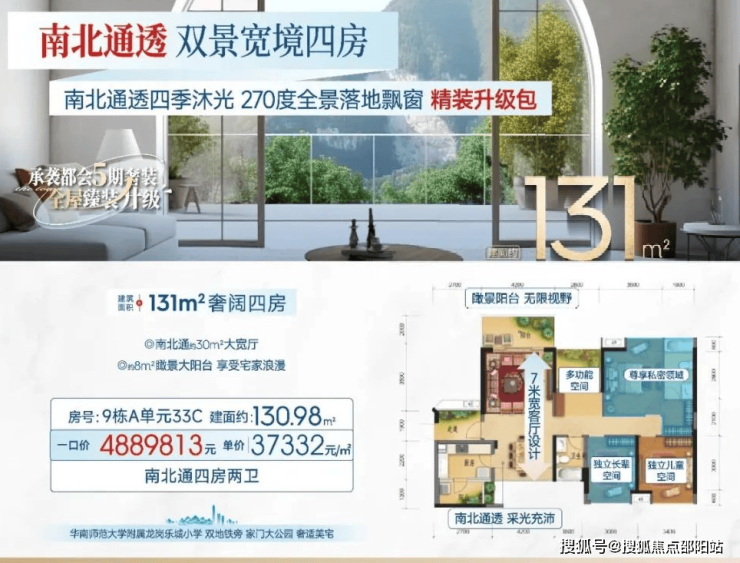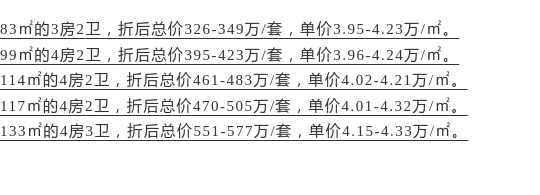 以这个折扣算,整体折后均价4.17万/㎡,折后单价3.95-4.33万/㎡,3房总价326万起,4房2卫总价395万起,4房3卫总价551万起,后期也会同步更新最终的折后价格。
