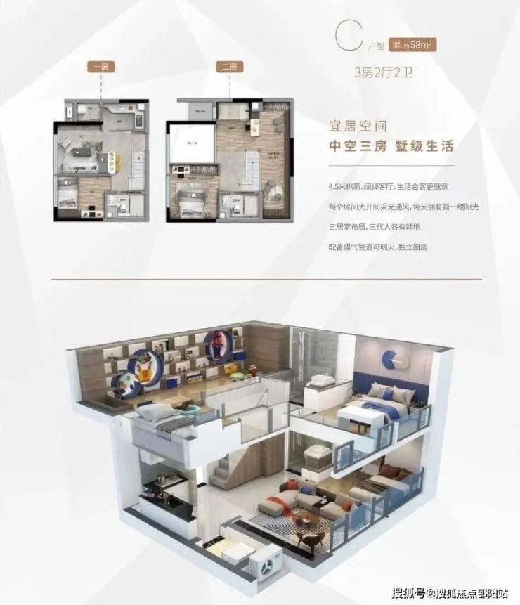 C户型建筑面积约58㎡,则是宽敞的宜居空间,配有独立厨房和燃气管道,满足日常生活所需。