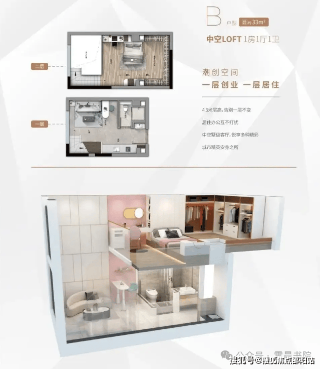 B户型建筑面积约33㎡,中空LOFT设计,既适合创业又适合居住;