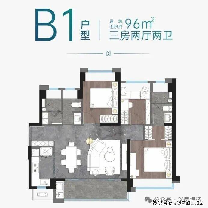 B1户型:建面约96㎡三房两厅两卫