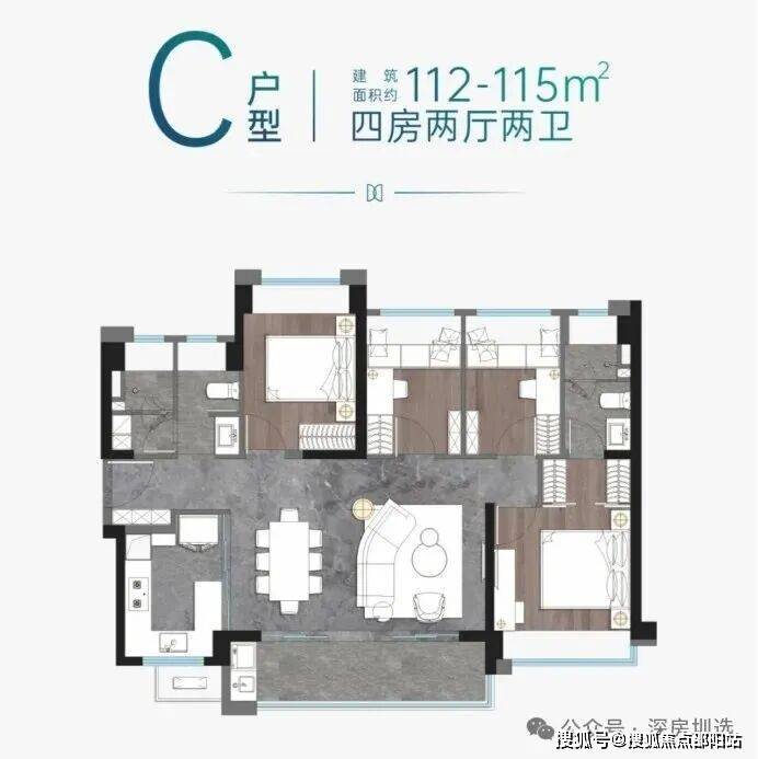 C户型:建面约112-115㎡四房两厅两卫