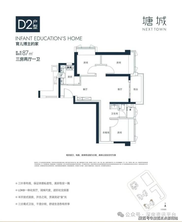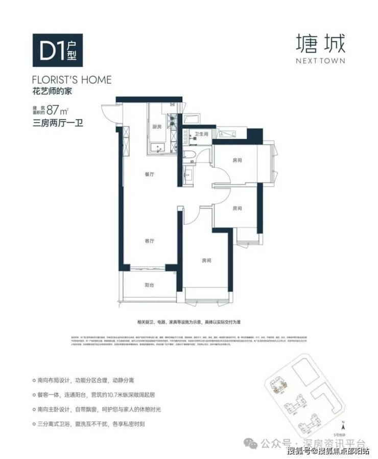 87㎡的3房2厅1卫( D1),设计的是竖厅格局,餐客一体,直通阳台,约10.7米纵深,南向主卧带飘窗,U型厨房,卫生间三段式分离设计,阳台东南朝向。