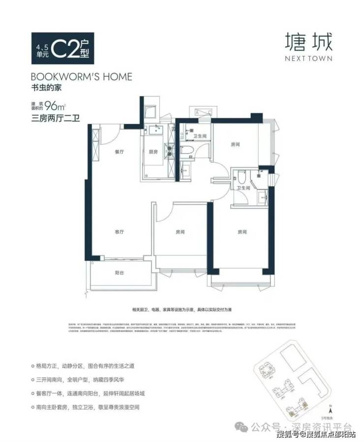 96㎡的3房2厅2卫(C2),设计的是竖厅经典格局,餐客厅一体化,三开间朝南,主卧套房设计,U型厨房,公卫三段式分离设计,阳台东南朝向。