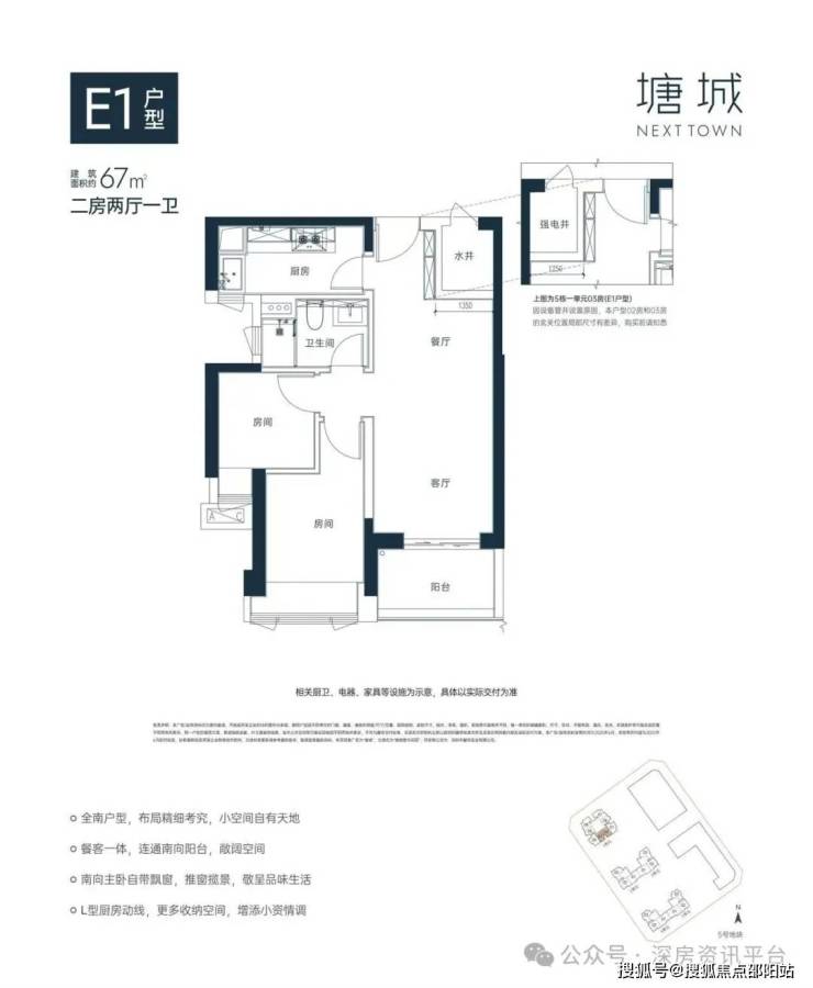 67㎡的2房2厅1卫(E1),设计的是竖厅格局,餐客一体,南向主卧带飘窗,L型厨房,阳台东南朝向。