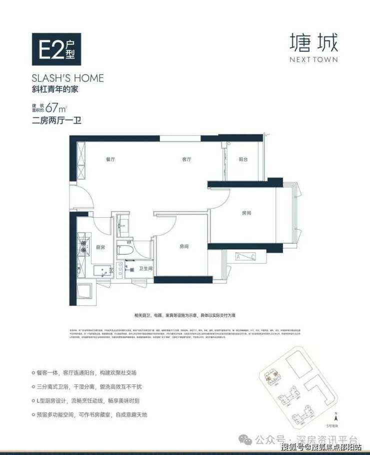 67㎡的2房2厅1卫(E2),设计的是竖厅格局,餐客一体,L型厨房,卫生间三段式分离设计,阳台预留多功能空间可以改小书房,西南或东北朝向。