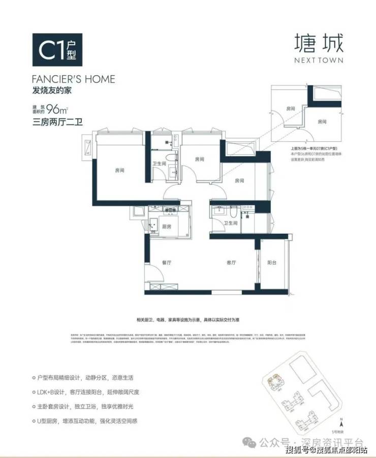 96㎡的3房2厅2卫( C1),设计的是竖厅格局,LDK+B一体化双厅,主卧套房设计,南向主卧带飘窗,U型厨房,阳台西南、东北朝向。