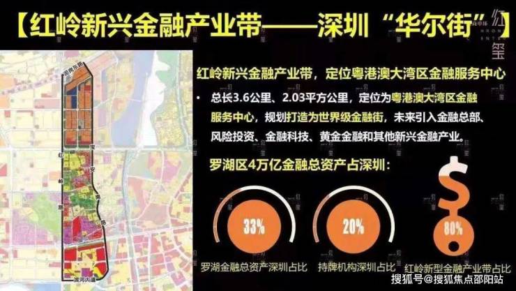 红岭创新金融产业带,是以红岭路为轴打造的创新金融产业带,长达3.6公里,用地面积2.03平方公里,旨在抢抓粤港澳大湾区城市群发展规划以及强区放权改革等重大机遇,其产业定位为新罗湖粤港澳大湾区金融服务中心,致力于打造深圳“华尔街”
