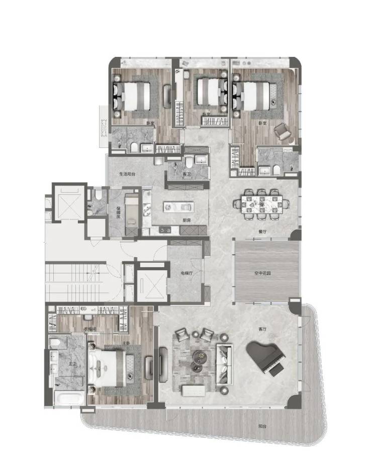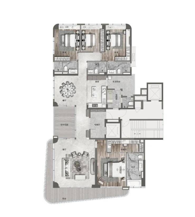 大平层采用的是单梯入户,户型的使用率非常高,我们首先来看看350㎡的大平层(5室2厅5卫),高层是带德系精装修交付的。