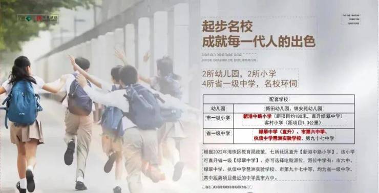 小学:新港中路小学(距项目180米,直升绿翠中学)、客村小学(距项目1.3公里)