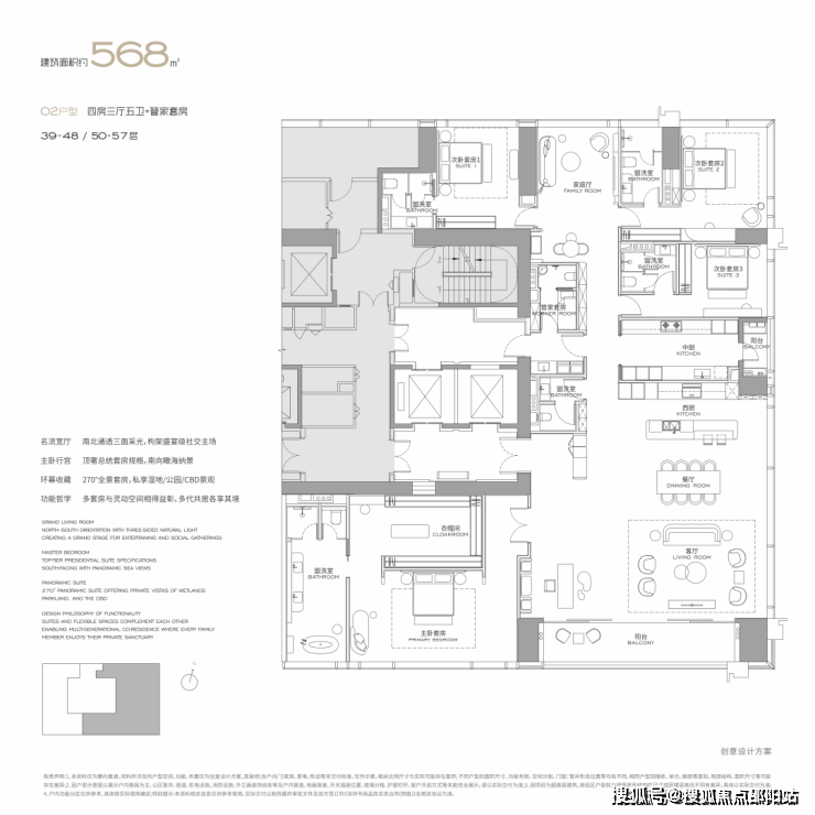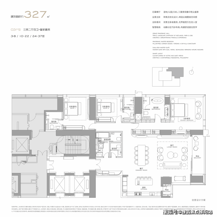 面积设计:300、400、460、570、1000平米纯粹大户型,空间方正,极致私密。