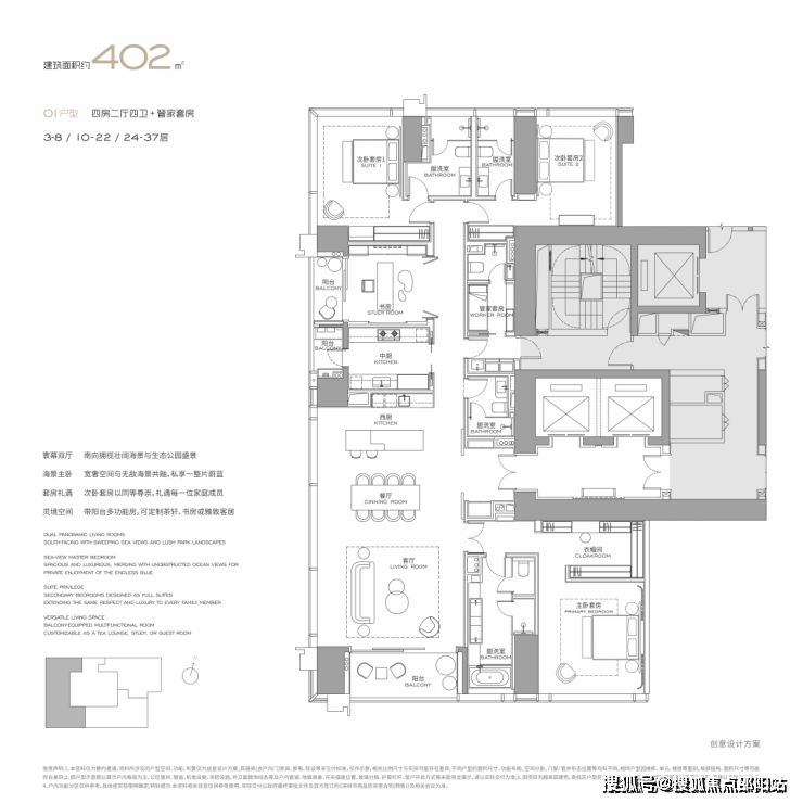 项目主力户型涵盖建面约300-1000㎡纯顶奢大平层,全系四房起步,主打300㎡阔绰四房、500-650㎡家族大平层、1000㎡天际复式,仅规划125席稀缺席位,圈层极致纯粹。户型由国际顶尖团队设计,户户南北通透,搭配270°全景落地窗与巨幕观景面,部分户型坐拥无遮挡深圳湾海景,层高奢阔,专梯专户设计,私密性与尊崇感拉满,LDKB一体化阔厅+多套房设计,完美适配塔尖家庭全周期居住与商务会客需求。