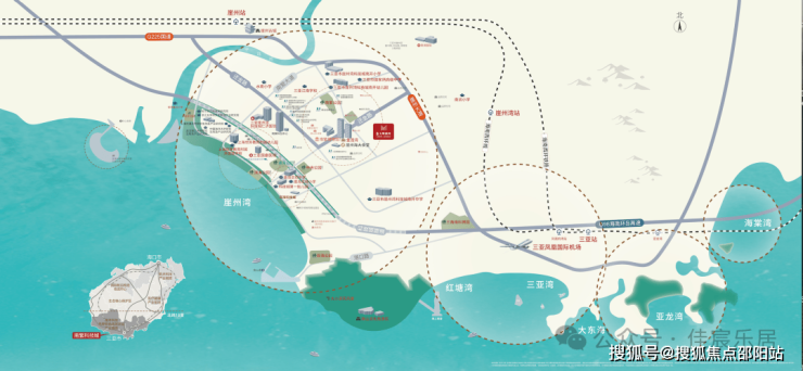 南繁公园中央景轴紧邻项目西侧、崖州湾海岸直线距离约2km