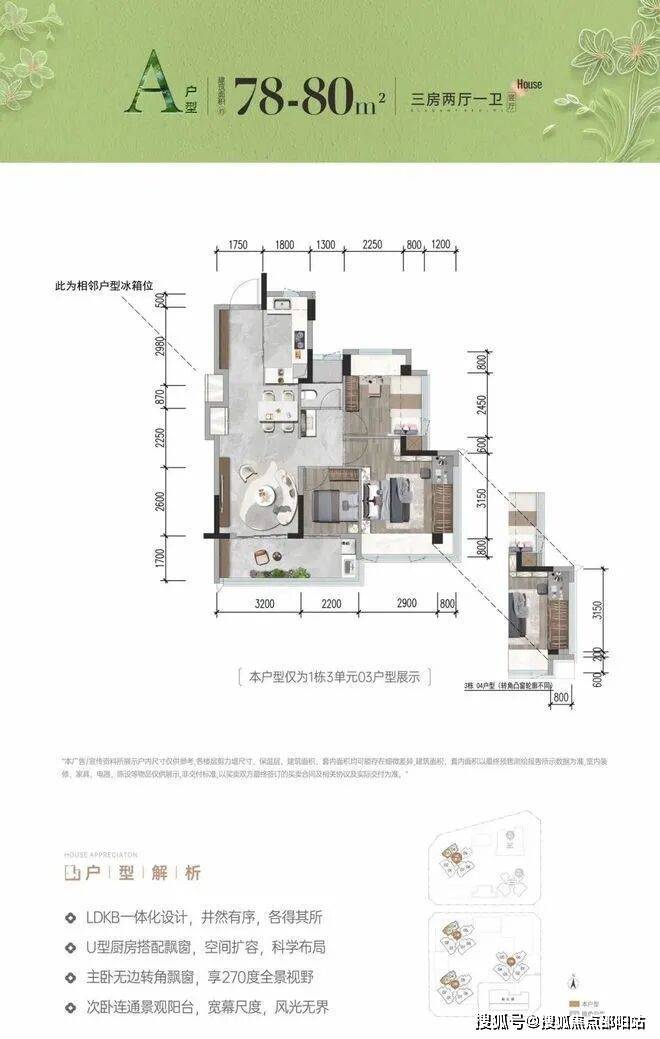 78-80㎡的3房2厅1卫,设计的是竖厅格局,客厅3.2米开间,LDKB一体化,S墙设计预留冰箱卡槽位,动静分区,主卧270无边转角飘窗,3个卧室分别做到了主卧16.62㎡/次卧9.27㎡/次卧5.72㎡(包含墙体飘窗),客厅连接次卧出5.4米长的大阳台,U型厨房,卫生间三段式分离,得房率约93-99%(包含赠送),西北朝向。