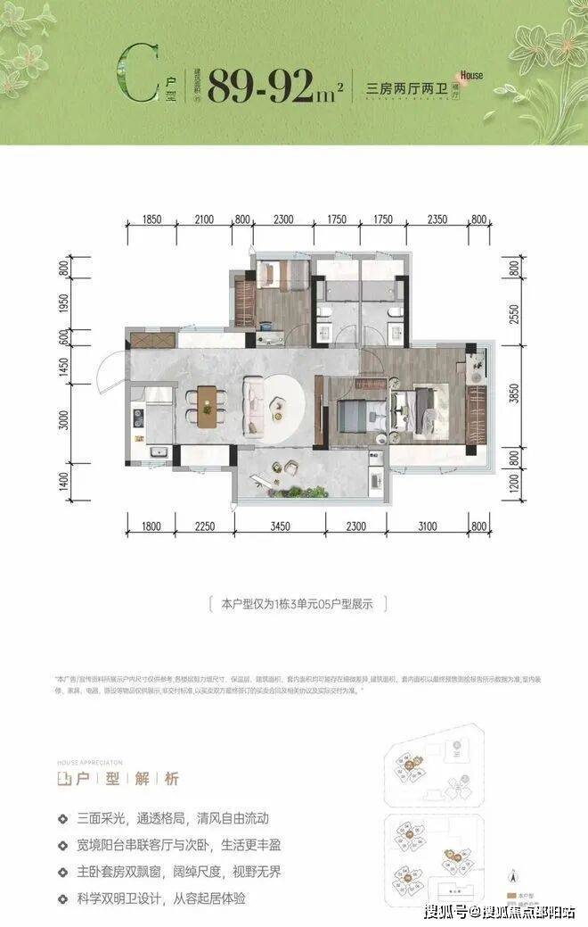 89-92㎡的3房2厅2卫,B户型,设计的是竖厅格局,客厅3.45米开间,LDKB一体化,S墙设计预留冰箱卡槽位,三开间朝南,动静分区,主卧270无边转角飘窗,3个卧室分别做到了主卧18.1㎡/次卧9.44㎡/次卧5.98㎡(包含墙体飘窗),客厅连接次卧出5.75米长的大阳台,U型厨房,公卫三段式分离,得房率约93-99%(包含赠送),西南或东南朝向。