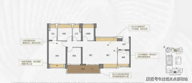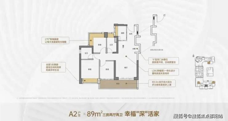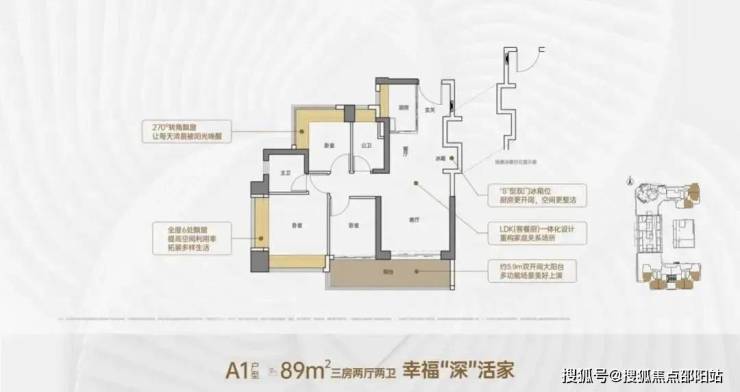 竖厅格局,客厅3.5米开间,LDKB一体化,S墙设计预留冰箱卡槽位,客厅连接次卧出5.9米长的大阳台,主卧双面飘窗,次卧270°转角飘窗,全屋6面飘窗,U型厨房,卫生间干湿分离。