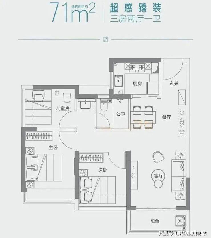 户型面积布局171平三房两厅一卫设计的是竖厅格局,餐客厅一体化,动静分区,客厅3.1米开间,3个卧室分别是2.8/2.7/2.2米的宽度,U型厨房,卫生间三段式分离设计,得房率:87.3%(包含赠送),阳台进深1.25米,有东北、西北或朝东向。