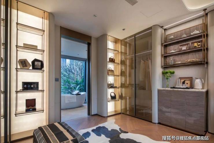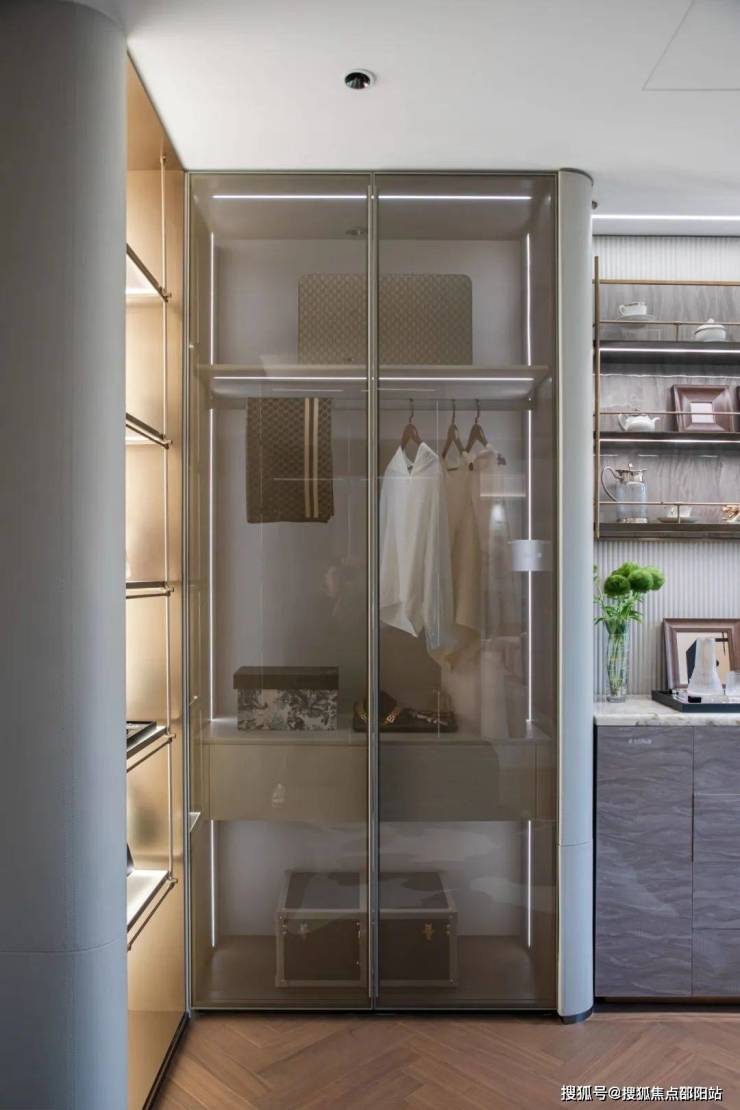好的设计能为居者带来更胜一筹的品质体验,衣柜是贴合弧形结构,弧边皮革层板构成材质的融合。无论是玻璃的通透,抑或是香槟金属色的光泽,皆以尊贵轻奢的仪式感,在层次上达到了微妙的平衡。