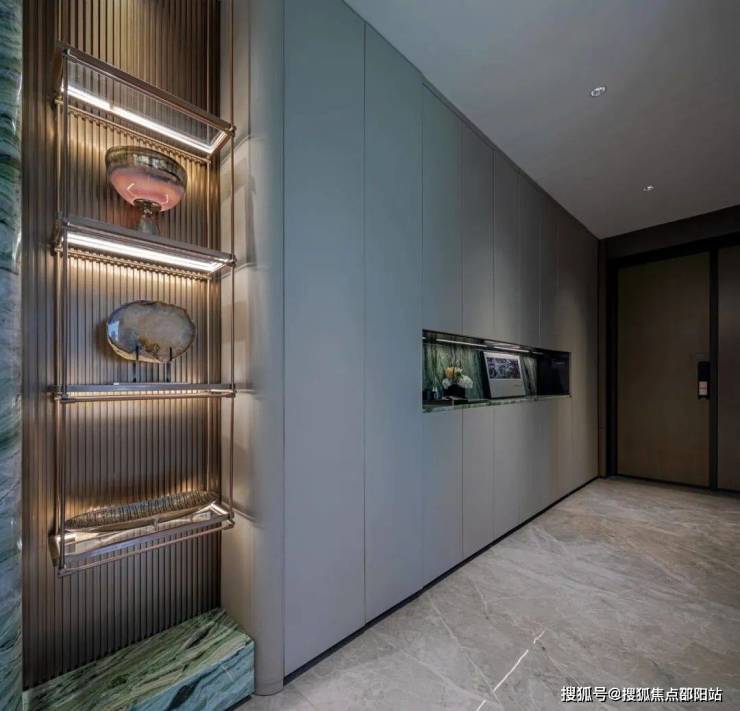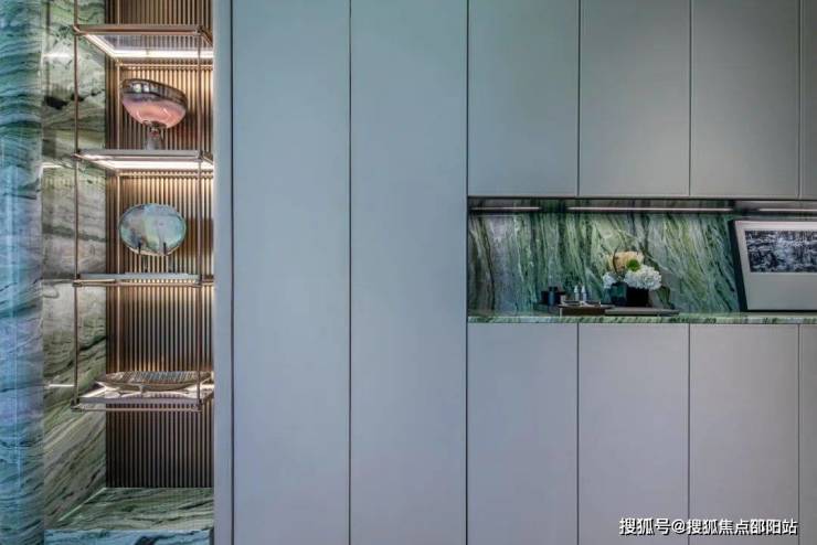 浅灰色烤漆玄关柜,中空镂空处匠心独运选用绿色玉石的设计,不仅展现了都市的现代摩登感,还让玉石在不同光线下展现出不同的质感,折射出居所的温度。