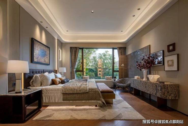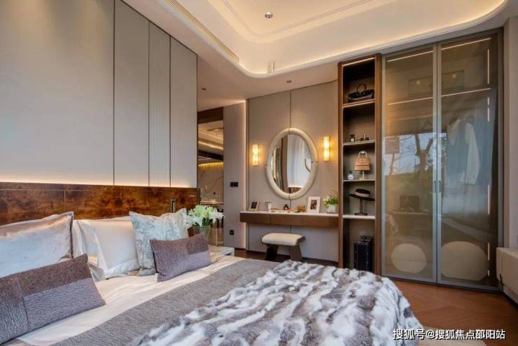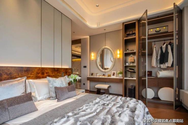 主卧有全景式落地窗,景观视野绝佳,衣柜的双侧夹丝玻璃柜门将卧室的奢华映像定格于朦胧的画幅之中,突破了传统柜门的局限性,雅致质感让每一次开合都别有仪式感。