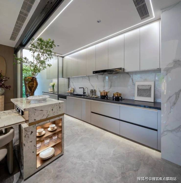 吊柜和地柜选择的是亚光灰六面烤漆,台面是梵高灰天然石,吊柜顶部和地柜底部配置LED灯带。烤漆和灯光是绝配,光打在漆面上,漫射出的氤氲氛围感,让产品整个轻奢气质大为提升。