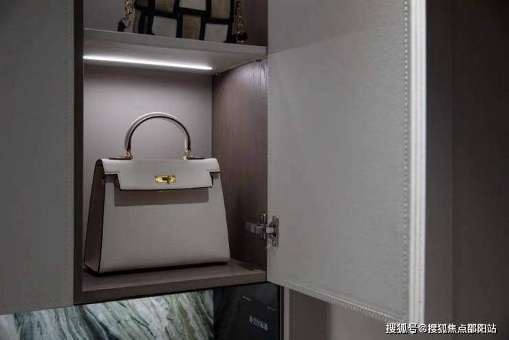 鞋帽间也可当做落尘间使用,放置鞋物、更换衣物都很方便。项目上,鞋帽间的固定层板选用了皮革材质,层板带灯,整体更精致。