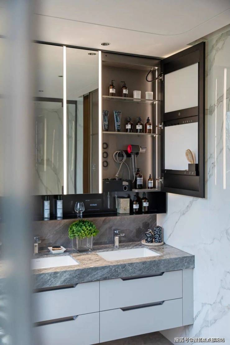 清爽开阔的浴室空间,能让人卸下满身疲倦。浴室柜配置了8MM钢化玻璃层板,镜柜前端配铝合金包边。浴室柜内的不见光灯条均为门控感应灯条,柜外见光区灯条均为开关控制,嵌入式灯的色温为3500k暖黄光,依靠灯光铺叙出柔和的氛围感。