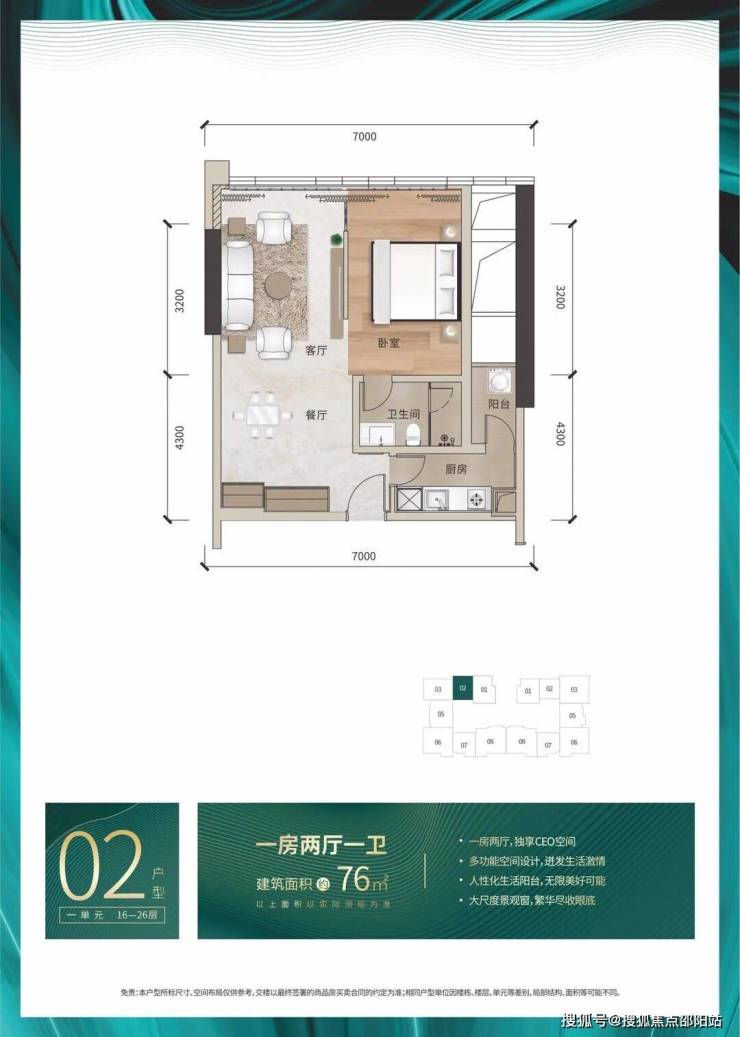 66/76 ㎡一房两厅一卫,
