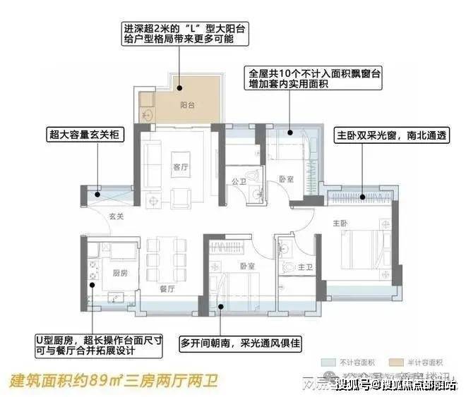89㎡的3房2厅2卫,设计的是竖厅南北通透格局,进门入户玄关,客厅3.3米开间,餐客厅一体化,五开间朝南,3个卧室分别做到了主卧13.42㎡/次卧8.83㎡/次卧6.75㎡(包含墙体飘窗),U型厨房,卫生间干湿分离,得房率85%,阳台主朝西北或东北向。