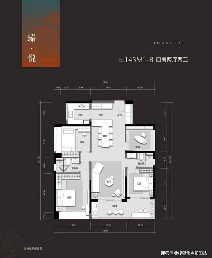 在传统南北对流的户型中,创新地将客厅开间拉大,达到约5.5米。除了可以摆放沙发,还可以在客厅后摆放钢琴、茶座等,扩展客厅的功能。而餐厅+厨房部分,开间约为5米,可改造为开放式厨房。书房与客餐厅连接的两面墙体,可根据家人需求灵活打通,扩展客餐厅空间。总的来说,143平A户型南北对流、格局分明,改造灵动性较高。