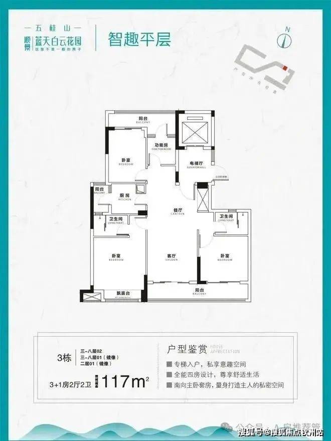 顺景蓝天白云容积率为1.5,绿化率38%,分别为时尚LOFT复式和智趣平层两款超产权面积使用空间设计创意户型产品。