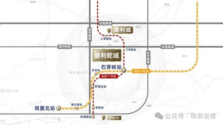 距双地铁(14&17号线)交汇站——石芽岭站仅百余米,14号线2站罗湖,3站福田,17号线直达罗湖口岸;