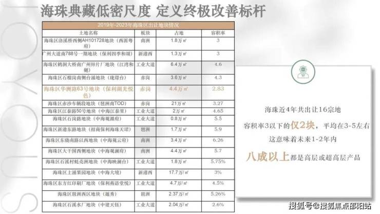 【低容积率土地稀缺】海珠近4年出让16宗地块,低于容积率3的仅2块,湖光就在其中,在中心区住宅持续向超高层靠拢的趋势下,低密叠墅产品占据了更多自然资源,在城市中心尤显珍贵及稀缺。