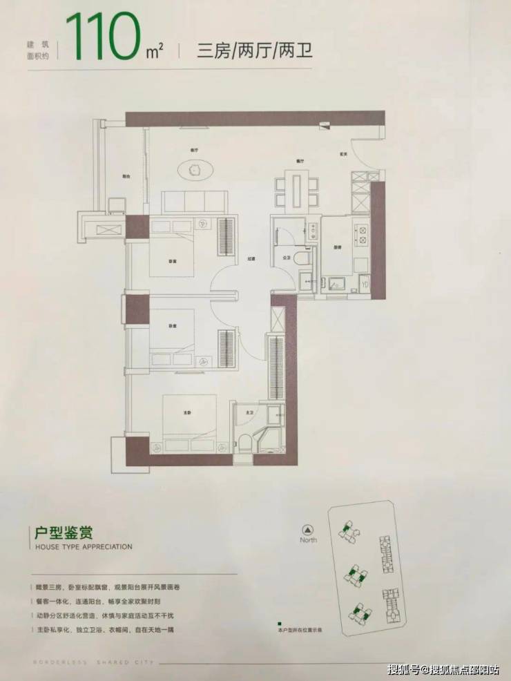 面积段最小的三房,主朝向为全向阳的设计,采光不错,有东南朝向和西北朝向