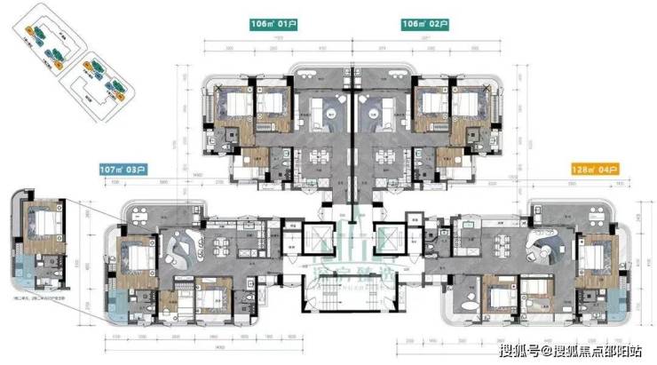 户型面积:106m三房二卫、107m三房二卫、128平四房二卫