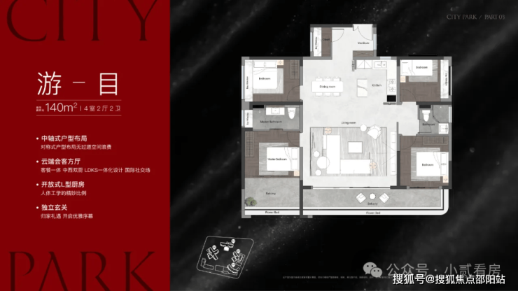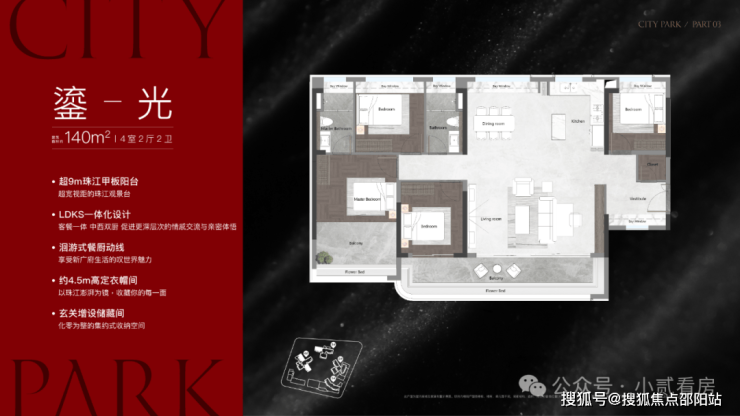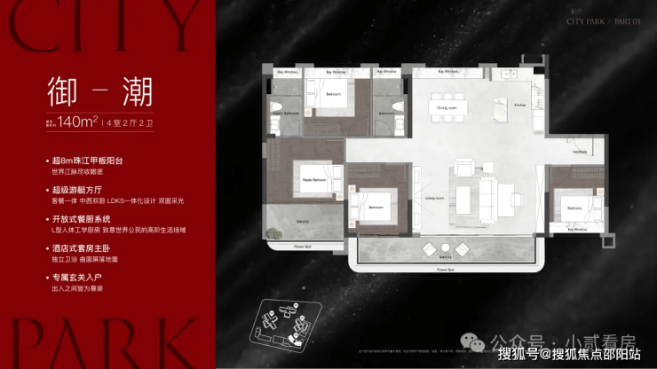 该栋为25层高,两梯三户设计,只有两个面积段,120㎡和140㎡,户型做得不错,在景观展现上用了功,极大程度去放大观江面,比方说超宽阳台、L型主卧转角飘窗、客厅预留观景飘窗等等,主打改善户型,2025年9月整体交房