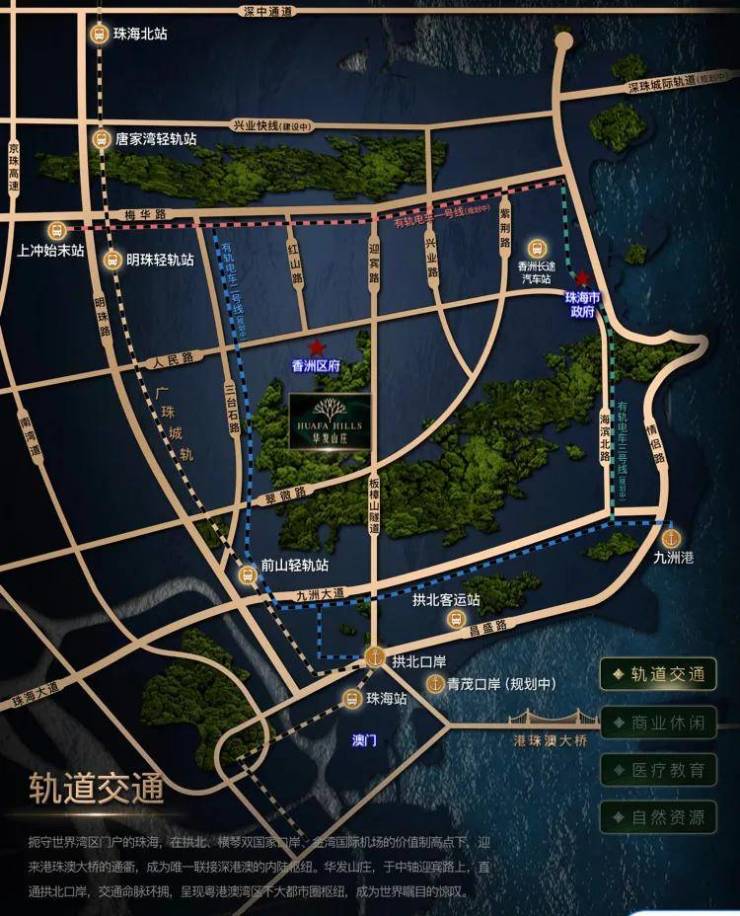 华发山庄雄踞珠海主城中心地段,迎宾大道之上,咫尺香洲、吉大商圈,尽享繁华万象。约5公里直抵九洲港码头、拱北口岸,跨越港珠澳大桥,快抵澳门,融通香港,从容生活峰层奢享。