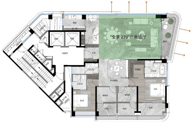 建筑面积约261㎡户型,设置5室2厅3卫,全明设计,南北对流,南向采光面约20m,其中阳台面宽就接近9m,视野十分阔绰。