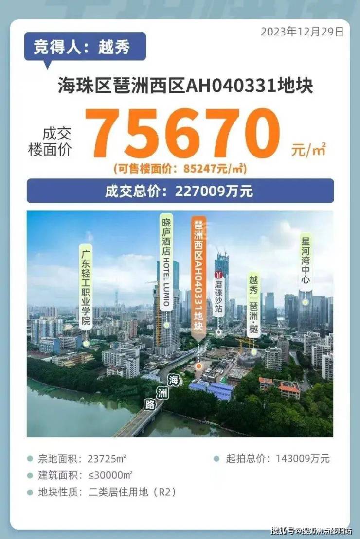 2023 年最后一个工作日,越秀地产广州区域成功拿下琶洲西区 AH040331 地块,折合楼面地价超 7.5 万 / 平,在全国地价排名中一度位列 TOP6。如今,该地块以 “琶洲・樾|华樾” 的正式案名亮相,由越秀地产和华发股份这两大国企携手开发。