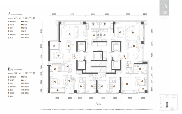 T3栋为266平和270平3房3厅3卫户型。266平主卧套房设计带有衣帽间、卫生间和景观阳台,功能齐全。次卧大小分布均衡。两个户型卧室设计均为同朝向,近40平会客厅,空间阔绰,且拥有优越的景观视野。