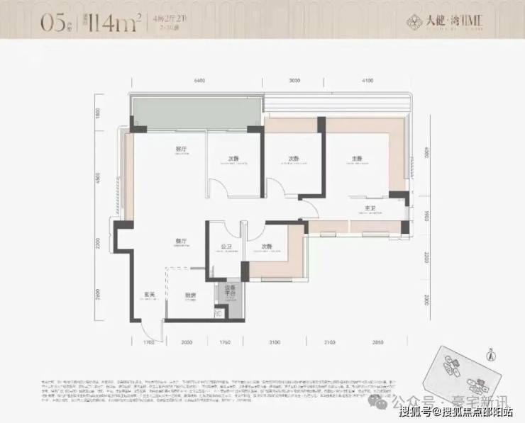 这个就是05的户型图,114平4房,传统动静分离竖厅户型,厅出大阳台,延伸到次卧,主卧和其中一个次卧双面飘窗采光,加上厨房外的设备平台,赠送面积大。