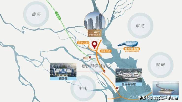 项目位于凤凰/凤亭大道上,可接驳南沙枢纽站、深中通道等核心交通主脉络,畅达大湾区。