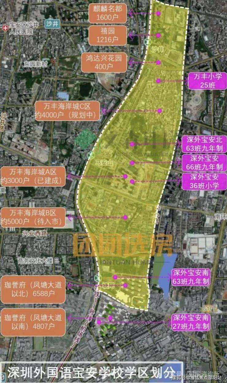 学区这里需要注意的是目前已经开学的有深外宝安校区,以及4-09地块的深外南校区63班九年一贯制预计最快今年9月借止开学,明年9月本部开学,这两个学区范围是凤凰大道以北,凤凰大道以南是不行,目前1-2-4-5区是凤凰大道以北也就是目前学区范围,3-6-7区是以南,其中深外宝安校区是明确了上不了,而本来就是珈誉府建的这个深外南4-09学校呢现在还没明确,据了解有可能上不了,不过一切以教育局公布为主,除了以上两个学校,367区也有建设一所学校,据了解规划是小学,后面又要改九年一贯制,不过这个学校也不大据了解可能是27-36班制的